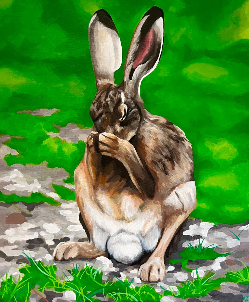 50x60cm (19.68x23.6”) acrylic canvas painting of a Hare. Finished with an acrylic gloss varnish. Fitted with D-rings and picture frame cord for easy hanging.